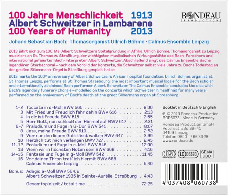 Organist und Urwaldarzt, Theologe und Bauleiter, Spendensammler und Hochschullehrer: Albert Schweitzer ist eine der faszinierenden Persönlichkeiten des 20. Jahrhunderts. Zum 100. Gründungstag seines Urwaldhospitals in Lambarene widmet ihm Rondeau Production eine außergewöhnliche Bach-Produktion. Ullrich Böhme, Organist an St. Thomas zu Leipzig, musiziert an Albert Schweitzers wichtigster musikalischer Wirkungsstätte, St. Thomas zu Straßburg. Ein Programm zu dem Anlass, den der Bach-Forscher und international gefeierte Bach-Interpret Albert Schweitzer an der Straßburger Thomaskirche kultiviert und als Tradition begründet hat: Das Gedächtniskonzert zum Todestag Johann Sebastian Bachs am 28. Juli an der größten in weiten Zügen erhaltenen Silbermann-Orgel Straßburgs. Durch all diese Konzerte zog sich Bachs legendärer Sterbechoral Vor deinen Thron tret ich hiermit. Wie Albert Schweitzer meist gesungene Bach-Choralsätze in seine Programme einbezog, hat das renommierte Calmus Ensemble Leipzig Bachs Choralbearbeitung für diese CD textiert und eingespielt. Der Widmungsträger Albert Schweitzer kommt im Bonus-Track mit einer historischen Einspielung von 1936 selbst zu Wort beziehungsweise Ton: Schweitzer spielt in der Straßburger Kirche Sainte-Aurélie das Adagio a-Moll aus Bachs Toccata C-Dur BWV 564.