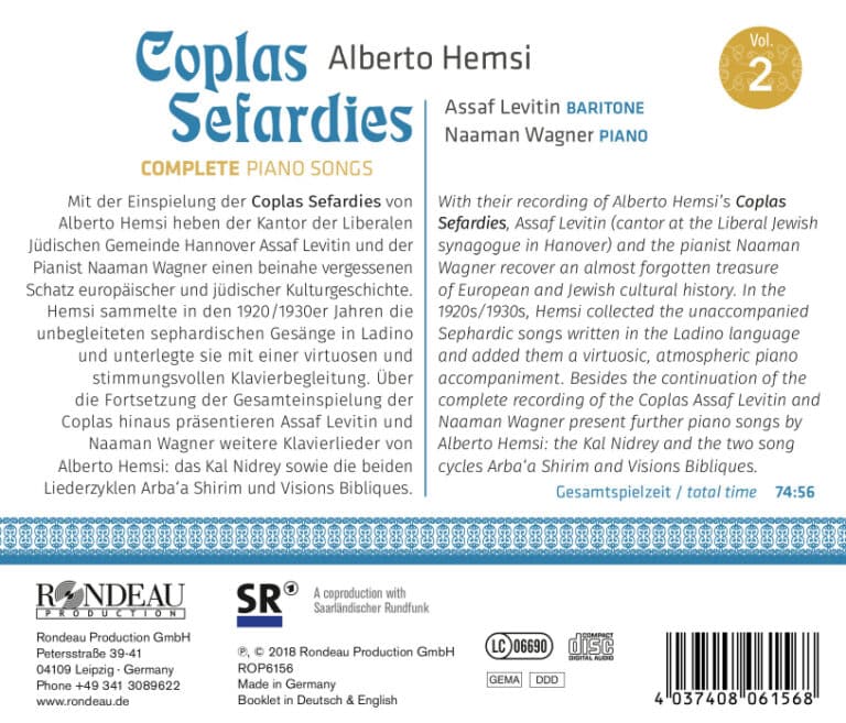 Mit der Einspielung der Coplas Sefardies von Alberto Hemsi heben der Kantor der Liberalen Jüdischen Gemeinde Hannover Assaf Levitin und der Pianist Naaman Wagner rechtzeitig zum 120. Geburtstag des Komponisten im Jahr 2018 einen beinahe vergessenen Schatz europäischer und jüdischer Kulturgeschichte. Hemsi galt als leidenschaftlicher Bewahrer und Fürsprecher der sephardischen Folklore und deren musikalischer Tradition. Über Jahre hinweg trug er zahlreiche Texte und Melodien dieses bis ca. 1500 ursprünglich in Spanien beheimateten, jüdischen Volkes zusammen, das sich nach seiner Vertreibung von der iberischen Halbinsel insbesondere auf den Mittelmeerraum verstreute. Er sammelte die monodischen und unbegleiteten Gesänge in Ladino, die bis dahin nur mündlich überliefert worden waren, und unterlegte sie mit einer virtuosen und stimmungsvollen Klavierbegleitung. Assaf Levitin und Naaman Wagner legen hiermit die zweite CD der erste Gesamteinspielung sämtlicher Coplas Sefardies von Alberto Hemsi vor. Darüber hinaus präsentieren sie im Rahmen der Gesamteinspielung sämtlicher Klavierlieder Hemsis Vertonungen liturgischer und paraliturgischer Texte in hebräischer und aramäischer Sprache: das Kal Nidrey sowie die beiden Liederzyklen Arba’a Shirim und Visions Bibliques.