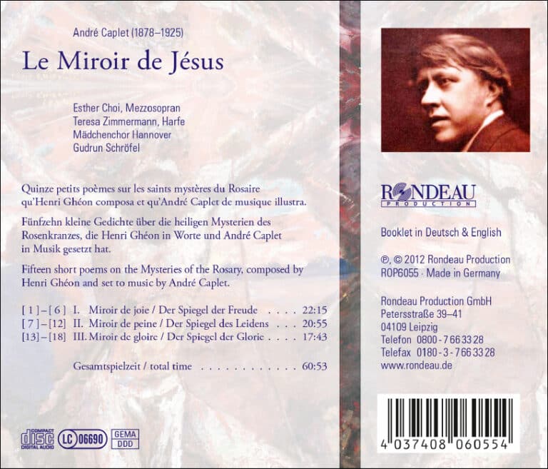 André Caplet (1878-1925) ist als Freund und Schüler Claude Debussys bekannt. Inspiriert von dessen Klangvorstellungen entwickelte er in seinem kurzen Leben jedoch eine ganz eigene musikalische Sprache. Das Hauptwerk Le Miroir de Jésus kam am 1. Mai 1924 in Paris unter der Leitung des Komponisten selbst zur Uraufführung. Auf der vorliegenden CD mit dem Mädchenchor Hannover unter Gudrun Schröfel ist nun erstmals eine Einspielung mit der Besetzung der Uraufführung zu hören: Caplet ließ 1924 einen Mädchenchor von solistischen Streichern begleiten. Ob Caplet diese Besetzung aus ästhetischen oder vielmehr aus wirtschaftlichen Gründen wählte, ist nicht bekannt. In der streng durchgearbeiteten Partitur ohne jedes für Klangrausch sorgende Beiwerk dürfte ihm diese kleine Besetzung jedoch entgegengekommen sein.