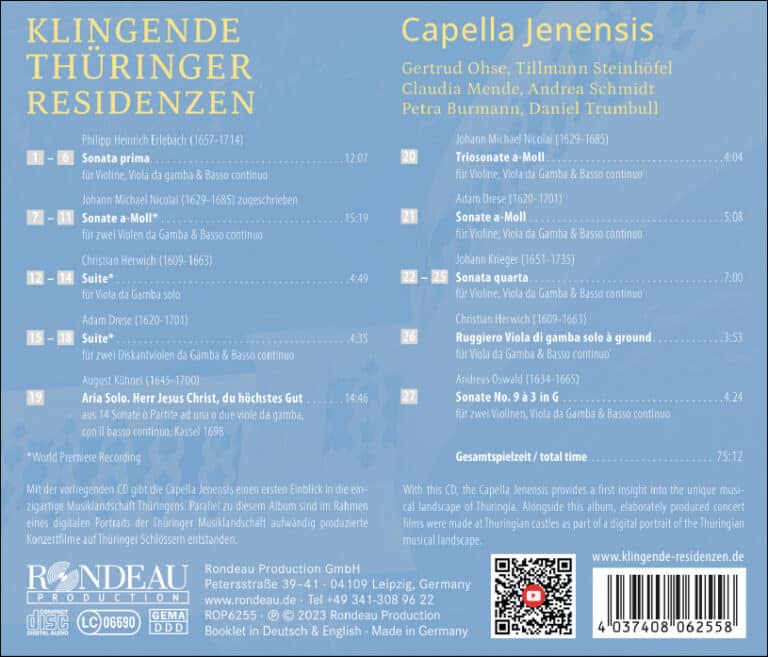 Mit der vorliegenden CD gibt die Capella Jenensis einen ersten Einblick in die einzigartige Musiklandschaft Thüringens. In den Fürstentümern der Thüringer Kleinstaaten gab es zahlreiche Hofkapellen, die miteinander im fruchtbaren Austausch standen und darüber hinaus ihre künstlerischen Impulse aus Italien, Frankreich und England erhielten. Parallel zu diesem Album sind im Rahmen eines digitalen Portraits der Thüringer Musiklandschaft aufwändig produzierte Konzertfilme auf Thüringer Schlössern entstanden.