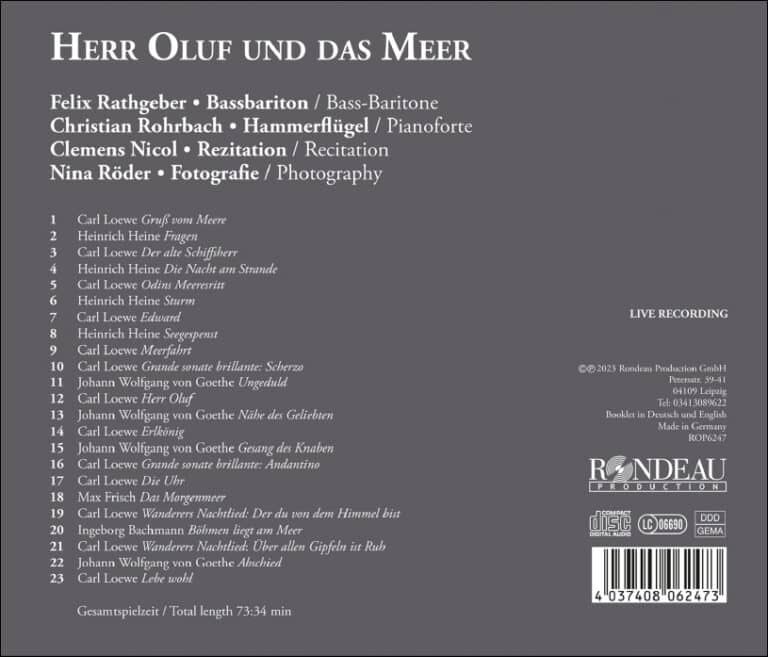 Das Programm dieses Albums – bestehend aus Liedern und Balladen von Carl Loewe sowie Texten und Gedichten von Heinrich Heine, Johann Wolfgang von Goethe, Max Frisch und Ingeborg Bachmann – reflektiert das Verhältnis des Menschen zum Meer. Carl Loewe, der Mitte des 19. Jahrhunderts als Kantor und Organist der Jakobikirche eine wichtige Persönlichkeit in Stettin war, inspirierte das Meer bei seinen Reisen nach Königsberg so sehr, dass er es in viele seiner Lieder und Balladen einfließen ließ. Der auf dieser Aufnahme zu hörende Hammerflügel No. 231 von Carl Julius Gebauhr von 1841 stammt aus der Schaffenszeit Loewes, und obgleich nicht bekannt ist, auf welchen Instrumenten Loewe in Königsberg spielte, wäre es zumindest möglich, dass es ein Instrument Gebauhrs war, dessen Werkstatt sich in Königsberg befand. Diese Live-Aufzeichnung eines Liederabends ist eines der Programme, in denen sich die Kunstformen Lied-Interpretation und Rezitation zu einer Gesamtdramaturgie ergänzen. Nina Röders Bilder inspirieren den Hörer zusätzlich auch optisch und erweitern den Horizont der Programmatik. So wird der Betrachter in den hier vorliegenden Arbeiten aus ihrer Serie „Über das Verschwinden“ an verwunschene Orte geführt und trifft geheimnisvolle Wesen. Dieser visuelle und dennoch poetische Blick schließt den Kreis durch die Konfrontation mit der Vergänglichkeit von Mensch und Natur – in Zeiten von Klimawandel und ansteigenden Meeresspiegeln aktueller denn je.