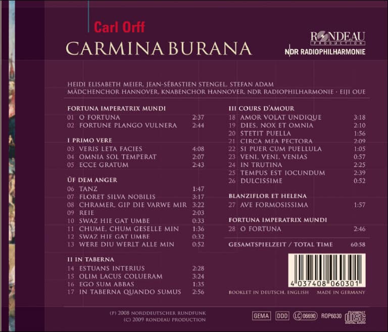 Alte Handschriften scheinen naturgemäß der Stoff zu sein, aus dem sich das Faszinosum Mittelalter am effektvollsten speist. So auch beim meistgespielten chorsinfonischen Werk überhaupt. Mit der einerseits skurill und fremd, andererseits zärtlich vertraut klingenden Musik gelang Carl Orff etwas zu jener Zeit einzigartiges! Keine bedeutende Komposition hat so radikal mit der Tonsprache gebrochen wie die 1937 uraufgeführte Carmina Burana: Weltliche Gesänge für Soli und Chor mit Begleitung von Instrumenten und magischen Bildern. Diese Magie ist in der vorliegenden Aufnahme förmlich zu spüren: Die erschütternde Gewalt des Eingangs- und Schlusschores, des Hymnus’ an Fortuna, mit den sperrig sich schiebenden Quinten und Quarten des Chores und die steten Repetitionen lassen im Chor bereits ekstatische Energieentladungen explodieren. In der CD-Einspielung von Rondeau Production treffen die beiden renommierten Chöre Niedersachsens aufeinander: der Mädchenchor Hannover und der Knabenchor Hannover, die durch ihre hervorragende Klangqualität auch über die Grenzen des Bundeslandes hinaus hoch gelobt werden; begleitet werden sie von der NDR Radiophilharmonie unter der Leitung ihres international bekannten Chefdirigenten, Eiji Oue.