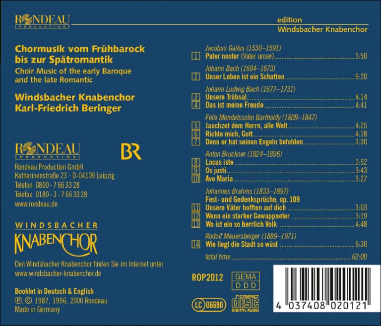 Das sind die Windsbacher, wie man sie kennt: Mit rekordverdächtigen Verkaufszahlen darf sich diese CD rühmen, die wohl beliebteste aller Aufnahmen des Windsbacher Knabenchores zu sein. Kein Wunder! Mit ihrem Repertoire umspannt die CD fünf Jahrhunderte geistlicher Chormusik. Angefangen bei Werken alter Meister, wie Jacobus Gallus und Johann Bach bis hin zu Johannes Brahms und Rudolf Mauersberger präsentiert die Aufnahme einen interessanten Querschnitt durch das geistliche Konzertprogramm der Windsbacher. Freuen Sie sich auf ein A-cappella-Konzert erster Klasse mit dem Windsbacher Knabenchor.