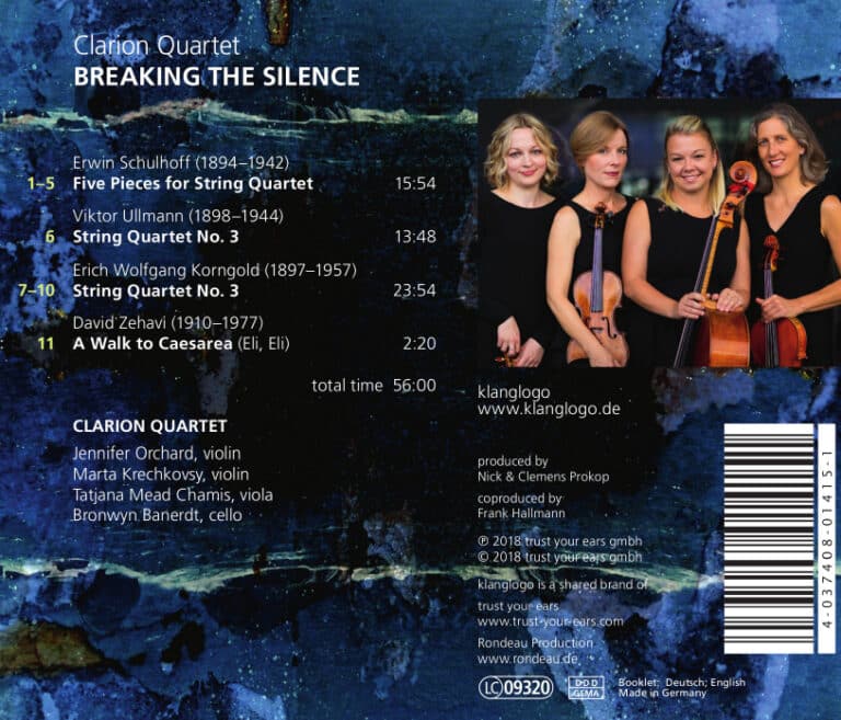 Debüt-CD des Clarion Quartet mit Musikerinnen des Pittsburgh Symphony Orchestra Der Titel ihrer Debut-CD ist Programm: „Breaking the Silence“, die Stille durchbrechen, ist genau, was sich die vier Musikerinnen des Clarion Quartet auf die Fahnen geschrieben haben. Sie widmen sich ganz der Musik jener Komponisten, die von den deutschen Nationalsozialisten behindert, verfolgt oder ermordet wurden. Es ist die Musik einer ganzen Generation, die erst allmählich wieder den Weg zurück in die Konzertsäle findet: Musik, die gehört werden sollte. Alle vier Musikerinnen sind Kolleginnen im Pittsburgh Symphony Orchestra, das Star-Dirigent Manfred Honeck zu neuem Glanz geführt hat. Ihre ausgeprägter Sinn für Teamplay, Präzision und Timing prägt auch ihr virtuoses Zusammenspiel im Streichquartett. Mit Erich Wolfgang Korngold, Viktor Ullmann und Erwin Schulhoff sind drei eigenständige Klangwelten vertreten. Die große verbindende Gemeinsamkeit ist: keiner der Künstler konnte sein Talent ungehindert entfalten – der große Bruch des Nazi-Regimes sowie des Zweiten Weltkriegs wirkt hier bis heute nach. Bereits in ihrer Debut-Saison 2016 nutzte das Quartett eine Europa-Tournee des Pittsburgh Symphony Orchestra für ein privates Konzert im historischen Musiksaal des Konzentrationslagers Theresienstadt (heute Terezín).