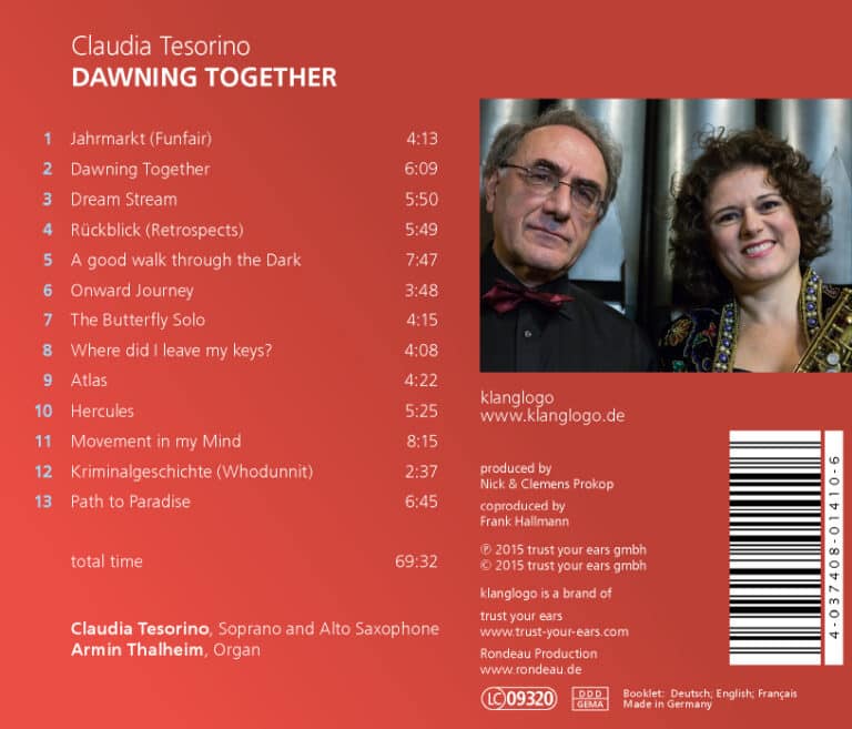 Zwei Welten treffen aufeinander – und verschmelzen: In „Dawning Together“ erschaffen die deutsch-kanadische Saxofonistin Claudia Tesorino und der Berliner Organist Armin Thalheim neue Klangwelten aus den ungleichen Instrumenten. Die CD dokumentiert eine faszinierende musikalische Freundschaft abseits ausgetretener Pfade. Die international gefragte Claudia Tesorino ist in unterschiedlichen Stilen zuhause; Jazz und Klassik, Big Band und zeitgenössische Uraufführungen schließen sich für sie nicht aus. Die Orgel gehört für sie selbstverständlich mit zum Klangspektrum. „Dawning Together“ entstand aus der Königsdisziplin des gemeinsamen Spielens: der freien Improvisation. Ihr Ziel ist, mit möglichst wenig Absprachen die Dynamik zwischen den Musikern zu beflügeln. Um diese Freiheit künstlerisch zu gestalten, anstatt sich in Beliebigkeit zu verlieren, braucht es Meister ihres Faches. Es ist ein gemeinsames Ringen um die Schönheit des Augenblicks. Ergebnis sind magische Momente: eine verblüffende Vielfalt an Farben und Stimmungen.