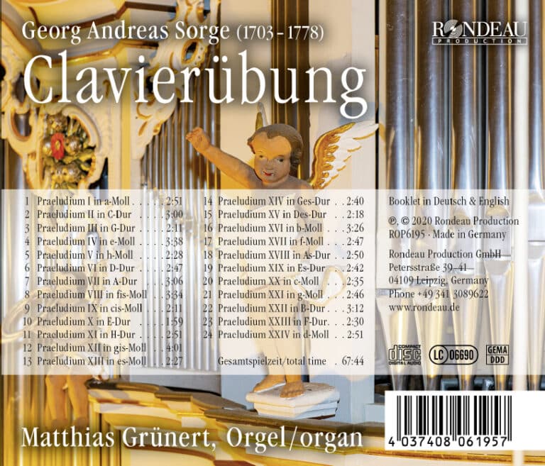 Dass die Clavierübung Georg Andreas Sorges (1703-1778) nicht nur musikalischen Wert, sondern auch pädagogischen Wert hat, wissen heutzutage die wenigsten. Das darf insofern verwundern, da sich die 24 Praeludien, die einmal den Quintenzirkel abhandeln, sicherlich zur großen barocken Orgelliteratur gehören. Matthias Grünert, Frauenkirchenkantor in Dresden widmet sich dieser oftmals zu Unrecht vergessenen Werksammlung. Ein Muss für jeden Orgelfan!