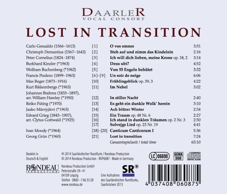 „Alles ist nur übergang / merke wohl die ernsten Worte, / von der Stunde, von dem Orte / treibt dich eingepflanzter Drang, / Tod ist Leben / Sterben Pforte, / alles ist nur übergang.“ Diese Inschrift soll einst eine alte Wiener Brücke geziert haben. Sie inspirierte Georg Grün zur Komposition „Lost in Transition“ sowie das Daarler Vocal Consort zur Einspielung seiner aktuellen CD mit dem gleichnamigen Titel. Es erklingen Werke vom 16. Jahrhundert bis hin zu zeitgenössischen Kompositionen – von Gesualdo über Demantius, Cornelius und Reger bis zu Mäntyjärvi, Moody und Grün, der selbst Sänger im Daarler Vocal Consort ist. Die vertonten Lebenssituationen – in denen die Uhr stehen geblieben ist, in der die Welt, wie sie war, nicht mehr, und in der Neues, Unbekanntes noch nicht ist – sind transparent und klar vom Daarler Vocal Consort interpretiert. Mit der aktuellen CD veröffentlicht Rondeau Production bereits die zweite CD mit diesem Ensemble: Die erste CD „Zwischen Himmel und Erde“ (CD ROP6034) wurde mit dem Pizzicato Excellentia Award ausgezeichnet.