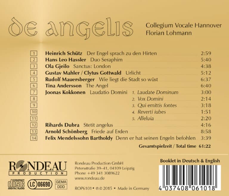 Engel, Mittler zwischen sichtbarer und unsichtbarer Welt, sind nicht immer leicht zu hören und zu sehen. Aber wenn Musik ihnen mit vertonten Texten Ausdruck und Klang verleiht, sind sie gegenwärtig: in Geschichte und Gegenwart, in Kriegs- und Friedenszeiten. Dieses musikalisch mitzuteilen, verlangt hohes künstlerisches Niveau, stilsichere Differenzierung und Nuancierung sowie gesanglich-innige Intensität. Dass Florian Lohmann und das Collegium Vocale Hannover bei ihrer Auswahl von zehn musikalischen Kleinoden aus fünf Jahrhunderten durchgehend auf Instrumentalbegleitung verzichten, verstärkt die Möglichkeit sinnlichen Erlebens, das auch religiös Unmusikalischen die Ahnung einer nicht mehr berechenbaren Wirklichkeit fühlen lässt. Die trauernde Fassungslosigkeit angesichts im Krieg zerstörter Städte ist emotional ebenso mitzuerleben wie das Aufscheinen einer verzauberten Welt im anbetenden Lobgesang – auch ohne kognitives Bewältigen von Texten und kompositorischen Details. Das Ausdrucksvolle, die Bewegtheit der Tonlinien, die Farbigkeit der Klänge, das Gegeneinander- Singen und Sich-Vereinen der Stimmen und Chöre, die Abwechslung des Stillen mit dem Erregten, des Traurigen mit dem Freudigen – hat zur Folge, dass diese Musik uns angeht und bewegt.