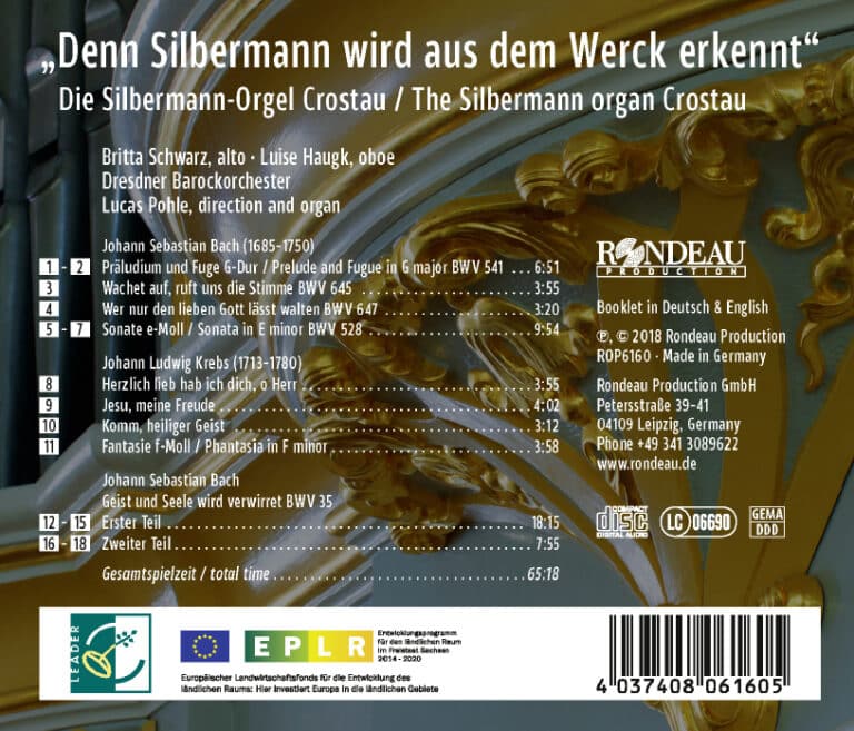 In der sächsischen Oberlausitz hat sich ein barockes musikalisches Kleinod erhalten: Die Silbermann-Orgel in der Kirche Crostau. Ihr Erbauer Gottfried Silbermann zählt zu den bedeutendsten Orgelbauern überhaupt und prägte Sachsens Orgellandschaft mit den von ihm geschaffenen 50 Instrumenten nachhaltig. Grundvoraussetzung dafür war der herrliche Klang seiner Instrumente und ihre vorzügliche technische Anlage. Mit einer klugen und stilsicheren Programmauswahl portraitiert der amtierende Kantor an der Kirche Crostau, Lucas Pohle, sein Hausinstrument: Es erklingen Präludium und Fuge G-Dur BWV 541 von Johann Sebastian Bach sowie Choräle aus der Sammlung Schüblers. Weitere Facetten der hervorragenden klanglichen Eigenschaften der Crostauer Orgel zeigen die Choralbearbeitungen für Oboe und Orgel des Bach-Schülers Johann Ludwig Krebs. Den krönenden Abschluss bildet die Kantate für Alt solo „Geist und Seele wird verwirret“ BWV 35 – eine der wenigen Kantaten des Leipziger Thomas-Kantors mit obligater Orgelstimme. Technisch versiert und mit feinsinnig-phantasievollen Registrierungen führt Lucas Pohle sein Publikum durch die Klangwelt dieses schönen Instruments. Die Altistin Britta Schwarz und die Oboistin Luise Haugk, unterstützt durch das Dresdner Barockorchester runden das gelungene Programm ab.