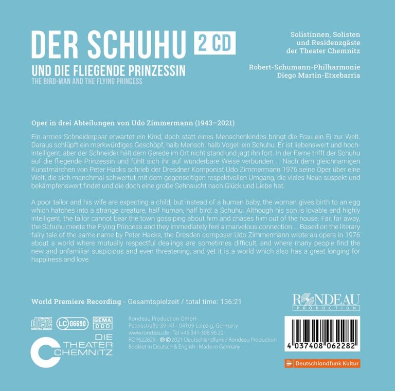 Oper in drei Abteilungen von Udo Zimmermann Ein armes Schneiderpaar erwartet ein Kind, doch statt eines Menschenkindes bringt die Frau ein Ei zur Welt. Daraus schlüpft ein merkwürdiges Geschöpf, halb Mensch, halb Vogel: ein Schuhu. Er ist liebenswert und hoch- intelligent, aber der Schneider hält dem Gerede im Ort nicht stand und jagt ihn fort. In der Ferne trifft der Schuhu auf die fliegende Prinzessin und fühlt sich ihr auf wunderbare Weise verbunden … Nach dem gleichnamigen Kunstmärchen von Peter Hacks schrieb der Dresdner Komponist Udo Zimmermann 1976 seine Oper über eine Welt, die sich manchmal schwertut mit dem gegenseitigen respektvollen Umgang, die vieles Neue suspekt und bekämpfenswert findet und die doch eine große Sehnsucht nach Glück und Liebe hat.
