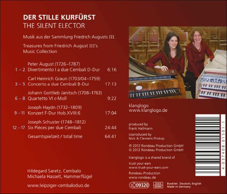 Das Leipziger Cembaloduo stellt mit der aktuellen CD Ersteinspielungen aus der Musikaliensammlung des sächsischen Kurfürsten Friedrich August III. (1750-1827) vor. Selten aufgeführte Werke für zwei Tasteninstrumente von Peter August, Joseph Schuster, Carl Heinrich Graun und Johann Gottlieb Janitsch gehören ebenso zu der kostbaren Sammlung wie das bekannte Konzert F-Dur von Joseph Haydn. Friedrich August III. war selbst ausgezeichneter Musiker und komponierte zu Weilen selbst. Sein wichtigster Musizierpartner war der Hoforganist und Kustos der Musikaliensammlung Peter August. Während sich dessen Kompositionstätigkeit fast ausschließlich auf Musik für Tasteninstrumente konzentrierte, sammelte er im Auftrag der Herrscherfamilie Abschriften ganz unterschiedlicher Werke und bearbeitete viele davon für zwei Cembali, um sie gemeinsam mit dem Kurfürsten zur Aufführung zu bringen. Das Leipziger Cembaloduo sind Hildegard Saretz (Cembalo) und Michaela Hasselt: Sie bevorzugt in der vorliegenden Einspielung einen Hammerflügel. Die Kombination von Cembalo und Hammerflügel ermöglicht eine klangliche Differenzierung, wie sie beim Musizieren mit zwei Cembali nicht möglich wäre.