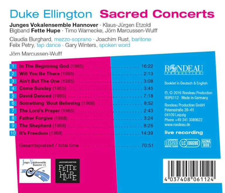 Die wichtigste Sache, die ich je getan habe – so bezeichnete Duke Ellington seine Sacred Concerts für Chor, Solisten und Bigband. Mit diesen drei Konzerten, von denen viele Titel heute als Standards gelten, schrieb der Großmeister des Jazz Musikgeschichte. Duke Ellingtons Sacred Concerts entstanden zwischen 1962 und 1973 und gleichen einer wunderbaren musikalischen Autobiographie des Komponisten. Kaum ein Jazzmusiker verstand es wie er, seine Musik so stark mit Emotionen zu füllen. Über allem steht Ellingtons unverrückbare Zuversicht auf Gott, sodass die Sacred Concerts zu einem ganz persönlichen Glaubensbekenntnis werden. Duke Ellington gehört zu den geistigen Vätern des Bigbandsounds und hat dieses Genre wie kein anderer geprägt: Bis heute versuchen Jazzorchester in aller Welt dem sogenannten Ellington-Effekt nachzueifern. Die Bigband Fette Hupe hat sich lange mit der Stilistik Ellingtons beschäftigt und mit dem Jungen Vokalensemble Hannover einen kongenialen Partner gefunden, um die monumentalen Sacred Concerts mit all ihrer ursprünglichen Kraft und Ausdrucksstärke auf die Bühne und auf CD zu bringen. Damit schließen Fette Hupe und das Junge Vokalensemble Hannover mit diesem höchst selten eingespielten Zyklus eine wichtige Repertoirelücke.