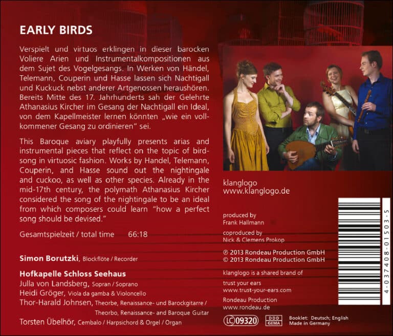 Die vorliegende CD Early Birds gibt das Sujet des Vogelgsangs in der Barockmusik wieder, welches in dieser Epoche besonders programmatisch-lautmalerisch umgesetzt wurde. Der Flötist Simon Borutzki wählt für seine akustische Vogelschau Werke, die besonders sein Instrument fordern: Zahlreiche Komponisten von Jacob van Eyck, Francois Couperin und Georg Friedrich Händel bis zu Louis Claude Daquin, von deutschen Landen nach Frankreich, Italien und England haben sich von dem Trillern und Zwitschern der Vögel – besonders der Nachtigall – inspirieren lassen und versucht, die Klänge stilisiert in Musik zu verpacken. Borutzki interpretiert die Kompositionen mit zahlreichen historischen Blockflötentypen, die dem kreativen Instrumentalisten eine breite Palette an Klangfarben eröffnen: Da gibt es die Sopranino, die Fifthflute, Sixth- und Fourthflute, Altblockflöten, die Voiceflute, die Tenor- und Bassflöte. Die Liedfolge auf der CD lässt sich im übrigen wie eine kleine Dramaturgie eines Vogellebens lesen: Nach zahlreichen Beispielen von Vogelflügen in Freiheit kämpft in Johann Adolph Hasses Bravourarie “L“augeletto in lacci stretto” der Vogel gegen die Gefangenschaft an und in Christoph Graupners Orchestersuite G-Dur GWV 466 erzählt der Satz “Uccellino chiuso” vom eingesperrten Vogel, der wimmernd im Käfig sitzt und schließlich tot von der Stange fällt.