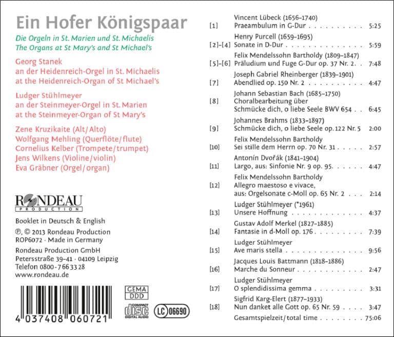 Mit der vorliegenden CD stellen die Hofer Stadtkantoren Georg Stanek und Ludger Stühlmeyer die beiden erhaltenen bedeutenden historischen Orgeln der Stadt vor: Werke von Vincent Lübeck, Henry Purcell, Johann Sebastian Bach, Antonín Dvorák und Jacques Louis Battmann spielt Georg Stanek an der Heidenreich-Orgel in St. Michaelis. Kompositionen von Josef Gabriel Rheinberger, Felix Mendelssohn Bartholdy, Sigfrid Karg-Elert und Ludger Stühlmeyer erklingen an der Steinmeyer-Orgel in St. Marien. Die Werke berücksichtigen die von den historischen Instrumenten bevorzugten Tonsprachen und schlagen zugleich einen Bogen von der Barockzeit über die Romantik bis in die Gegenwart. Die Stadt Hof kann auf eine ungewöhnlich lange und facettenreiche Musikgeschichte zurückblicken. Ihre musisch-kulturellen Wurzeln reichen bis ins Mittelalter. Von den Kirchen über die mit ihnen verbundenen Lateinschulen mit ihrer reichen Chormusiktradition, die Stadtpfeifer, das Convivium Musicum bis zu den Hofer Symphonikern, dem Theater und den Konzertreihen der beiden Stadtkirchen entfaltet sich die heutige Musikszene auf der Grundlage einer achthundertjährigen Geschichte.
