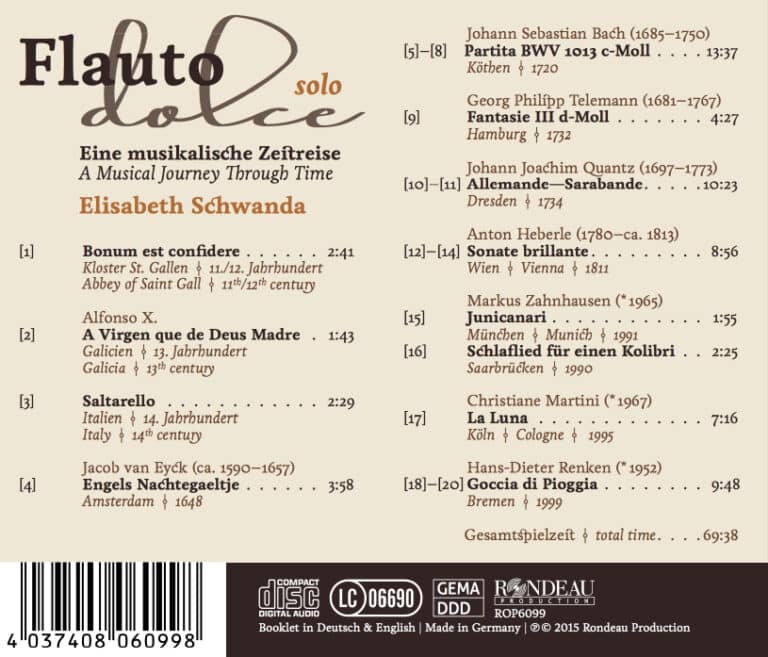 Eine Musikerin – zehn Flöten – zwölf Komponisten – 21 Werke – 1000 Jahre Musik: Der Blockflötistin Elisabeth Schwanda ist keine Reise zu weit, wenn es darum geht, die Möglichkeiten ihrer Instrumente auszuloten. Bei ihrer Fahrt durch die Jahrhunderte war sie den unterschiedlichen Stilistiken auf der Spur und präsentiert nun auf ihrer Solo-CD „Flaute dolce solo – Eine musikalische Zeitreise“ Klänge von „mönchischen“ Melodien bis zur Minimal Music, vom Mittelalters und Renaissance über Barock und Romantik bis hin zur Zeitgenössischen Musik. Jongleure und Feuerspucker, Nachtigallen, Regentropfen und Kolibris sind hier zu entdecken, wenn berühmte Kompositionen von Jacob van Eyck, Johann Sebastian Bach, Georg Philipp Telemann und – natürlich – Johann Joachim Quantz vorgetragen werden. Doch auch weniger prominente Namen wie Anton Heberle, Narcisse Bousquet und Christiane Martini tauchen auf und lassen die Zeitreise gleichzeitig zu einer spannenden Expedition in unbekannte – aber nicht weniger wunderbare – Gefilde werden.