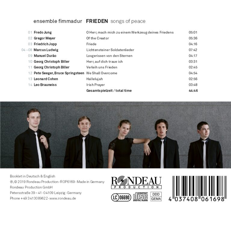 Es gibt Themen, die nie ausdiskutiert sind. Frieden gehört dazu. Frieden und vor allem wie wir zum Frieden kommen, hat die Menschheit schon immer beschäftigt. Auf der anderen Seite gibt es nach zigtausenden von Jahren immer noch Kriege. Ist die gewalttätige Auseinandersetzung Teil des menschlichen Wesens? Ist Frieden wirklich so schwer? Wo fängt man überhaupt an? Wo sucht man Frieden? Im Sozialen, Religiösen, in einem selbst? Fragen über Fragen, bei denen es schier unmöglich erscheint den Überblick zu behalten. Wie also arbeitet man für den Frieden und was kann der einzelne Mensch tun? Das Ensemble fimmadur hat verschiedenen Komponisten die Aufgabe gegeben, das Thema Frieden musikalisch anzugehen. Sechs Auftragskompositionen von leipziger Komponisten sind dabei entstanden, die nun auf dieser CD aufgenommen wurden. Ergänzt werden sie von zwei Stücken des Altthomaskantors Georg Christoph Biller sowie mit dem von Stefan Nagy und Jonathan Wikeley arrangierten Song „Hallelujah“ Leonard Cohens und einer eigenen Bearbeitung von Peter Seeger und Bruce Springsteens Version von „We shall overcome“.