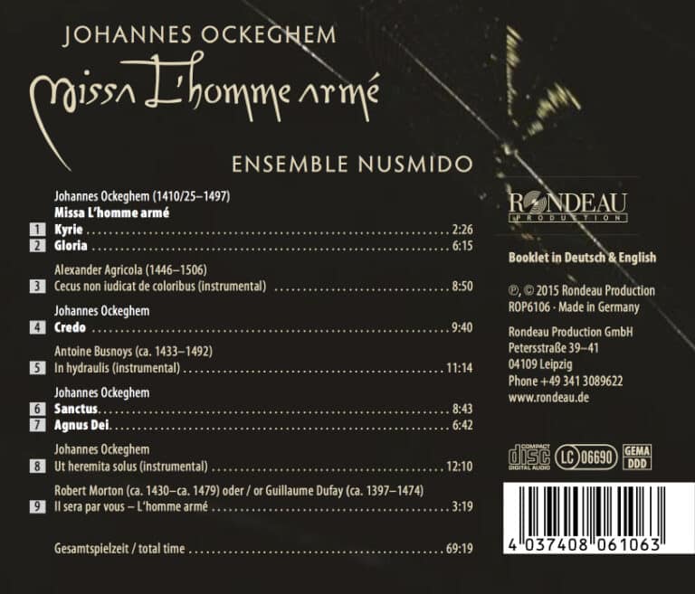 Mal vierstimmig A cappella, mal instrumental begibt sich das Ensemble Nusmido in die Zeit von vor 600 Jahren und versucht, dem klanglichen Ideal der frühen Mehrstimmigkeit möglichst nahe zu kommen. Flexible Tongebung abseits eines starren Denkens in Takten, ein möglichst intensives kontrapunktisches Zusammenspiel und die natürliche Verbindung des Musikers zur Akustik des Raumes stehen bei ihnen als Sänger wie als Instrumentalisten im Mittelpunkt. „Johannes Ockeghem – Missa L“homme armé“ wird so zu einer spannenden Reise in längst vergangene Zeiten voller Ritter, Burgen und wunderbarer Musik. Die Chanson L’homme armé(Der bewaffnete Mann) zählt zu den populärsten Liedern des Mittelalters. Die tapferen Recken, die hier besungen werden, die sicheren Siege und blutigen Schlachten spielten im 15. Jahrhundert eine immense Rolle im Denken der Menschen. Denn kaum war der Hundertjährige Krieg überwunden, eroberten die Osmanen Konstantinopel und drohten in Europa einzufallen. Die augenscheinlich schlichte Melodie des L’homme armébildet die Grundlage für mehr als dreißig Messen im 15. und 16. Jahrhundert. Eine dieser Messen stammt aus der Feder des flämischen Komponisten Johannes Ockeghem.