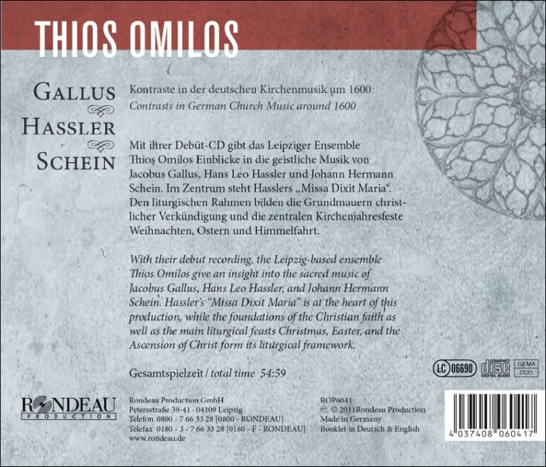 Mit ihrer Debüt-CD gibt das Leipziger Ensemble Thios Omilos Einblicke in die geistliche Musik von Jacobus Gallus, Hans Leo Hassler und Johann Hermann Schein. Im Zentrum steht Hasslers Missa Dixit Maria. Den liturgischen Rahmen bilden die Grundmauern christlicher Verkündigung und die zentralen Kirchenjahresfeste Weihnachten, Ostern und Himmelfahrt. Ein spannendes Experimentierfeld sind die Jahre vor, um und nach 1600 für die Künste gewesen! In der Musikgeschichte erweisen sie sich als ein Zeitraum voller Gegensätze. Traditionelle Satztechniken stehen Neuerungen gegenüber, die nicht zuletzt mit der rasanten Entwicklung der Instrumentalmusik innovative Gattungen wie Oper und Oratorium, geistliches Konzert und Kantate, aber auch die rein instrumentale Sonate, die Suite und das Concerto hervorbringen. Mit den Kompositionen vorliegender Aufnahme zeigt das Ensemble Thios Omilos dem Hörer, wie nahe Aufbruch und Tradition, Neues und Altes mitunter beieinander liegen, ineinander greifen und wie wenig das Eine ohne das Andere denkbar ist, mag auf den ersten Blick verblüffen. Wer jedoch gespannt ist zu hören, wie sich die Neue Musik des 17.Jahrhunderts Bahn bricht, ohne ihre historische Herkunft zu verleugnen, der lasse sich von Thios Omilos mitnehmen in die Welt von Gallus, Hassler und Schein.