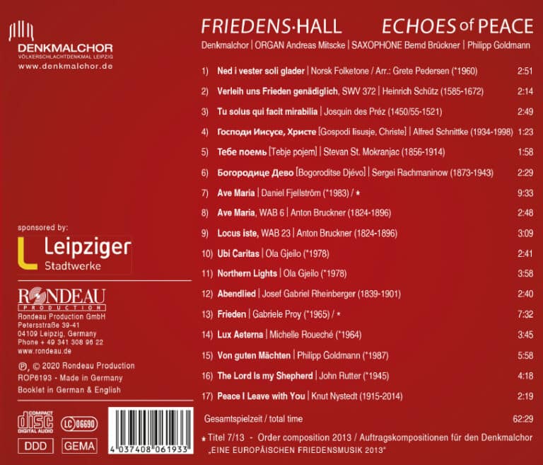 Chorklänge aus dem Völkerschlachtdenkmal |Mit seinem auf dieser CD vorliegenden Programm „Friedens Hall“ ist der Denkmalchor als Reisender, Botschafter und Suchender eines gemeinsamen Friedensklangs unterwegs. Das Motto präsentiert das Ensemble unter Leitung von Philipp Goldmann in ganz unterschiedlichen Assoziationen: Allein die musikalische Bandbreite aus über fünf Jahrhunderten Musikgeschichte sprengt bewusst alle Grenzen.