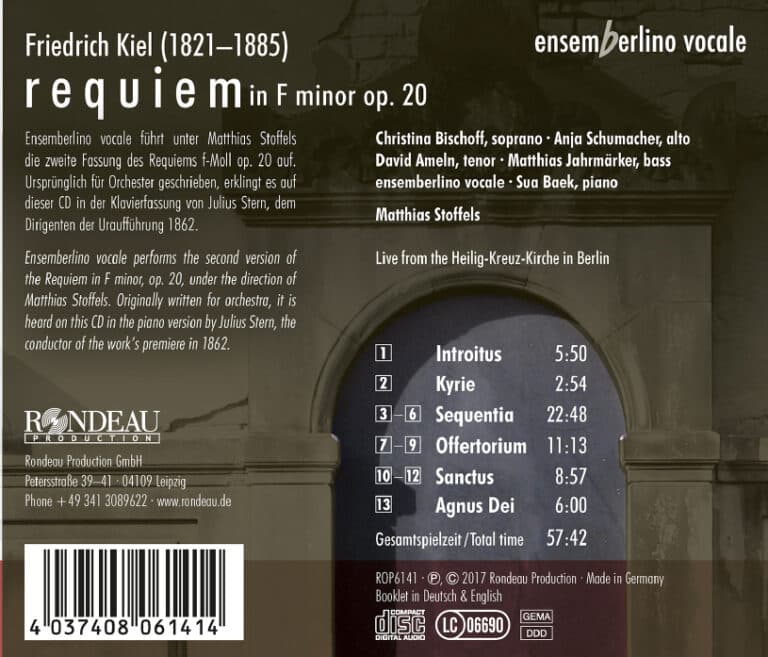 Friedrich Kiel (1821–1885) galt bei seinen Zeitgenossen als angesehener Kompositionslehrer und herausragender Komponist, der in einem Atemzug mit Johannes Brahms genannt wurde. Das Requiem f-Moll op. 20 schlägt stilistisch die Brücke zwischen den Requiem-Vertonungen von Wolfgang Amadeus Mozart und Giuseppe Verdi und bildet einen Meilenstein protestantischer Requiem-Vertonungen. Als Inspirationsquelle mögen die Requiem-Vertonungen von Wolfgang Amadeus Mozart und Luigi Cherubini gedient haben, dennoch sind Kiels musikalische Ideen neu und typisch romantisch. Die Begeisterung für anspruchsvolle Vokalprojekte und die Lust, auch unkonventionelle musikalische Wege zu beschreiten, verbindet die Mitglieder des Berliner Kammerchores Ensemberlino Vocale unter der Leitung von Matthias Stoffels. Der vielfach ausgezeichnete Chor verzichtet bei seiner Debüt-CD mit der weltweit ersten Einspielung des Werkes bewusst auf ein Orchester und präsentiert das Requiem im Stile der Uraufführung mit kammermusikalischer Klavierbegleitung.