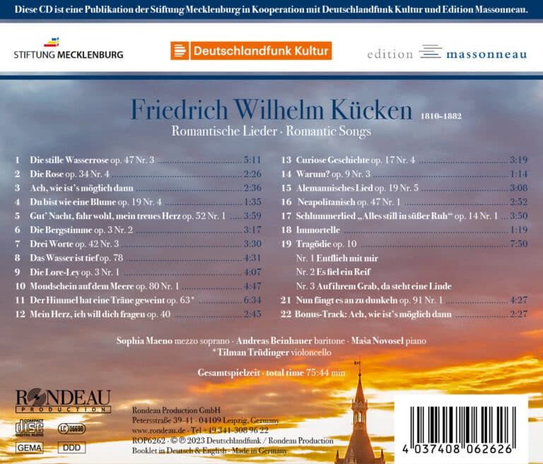 Das vorliegende Album gewährt einen faszinierenden Einblick in das Leben und Schaffen des Komponisten Friedrich Wilhelm Kücken. Geboren 1810 in Bleckede bei Lüneburg, führte sein musikalisches Talent ihn früh nach Schwerin. Das Album präsentiert nahezu ausschließlich Weltersteinspielungen seiner Lieder, die bisher weitgehend in Vergessenheit gerieten. Kückens einfühlsame Melodien und seine meisterhafte Kompositionskunst kommen auf dem neu erschienen Album voll zur Geltung, von anrührenden Abschiedsliedern bis zu heiter-humorvollen Stücken. Die kritische Ausgabe, auf der die Einspielungen basieren, stammt aus der Edition Massonneau. Die Widmungen der Lieder erzählen spannende Geschichten über Kückens persönliches Umfeld. Ein beträchtlicher Teil des Vermögens von Kückens Frau Henriette, einschließlich seines Wohnhauses, wurde der nach ihm benannten Stiftung vermacht. Die Stiftung unterstützte bis 1939 „mittellose musikalische Talente, Componisten, Lehrer, Sänger, Solaspieler irgendeines Instrumentes.“ Die vorliegende CD ist eine Publikation der Stiftung Mecklenburg in Kooperation mit Deutschlandfunk Kultur, Rondeau Production und Edition Massonneau.