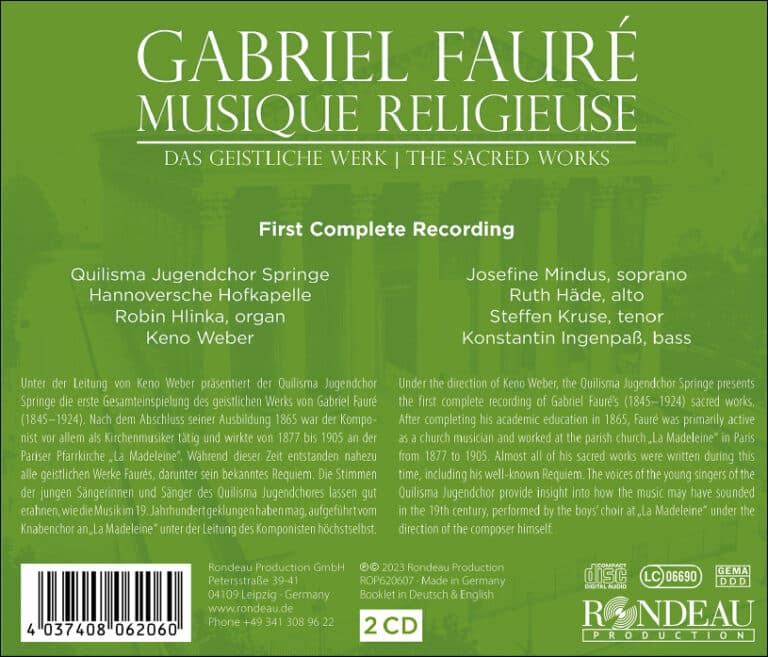 Unter der Leitung von Keno Weber präsentiert der Quilisma Jugendchor Springe die erste Gesamteinspielung des geistlichen Werks von Gabriel Fauré (1845–1924). Nach dem Abschluss seiner Ausbildung 1865 war der Komponist vor allem als Kirchenmusiker tätig und wirkte von 1877 bis 1905 an der Pariser Pfarrkirche „La Madeleine“. Während dieser Zeit entstanden nahezu alle geistlichen Werke Faurés, darunter sein bekanntes Requiem. Die Stimmen der jungen Sängerinnen und Sänger des Quilisma Jugendchores lassen gut erahnen, wie die Musik im 19. Jahrhundert geklungen haben mag, aufgeführt vom Knabenchor an „La Madeleine“ unter der Leitung des Komponisten höchstselbst.