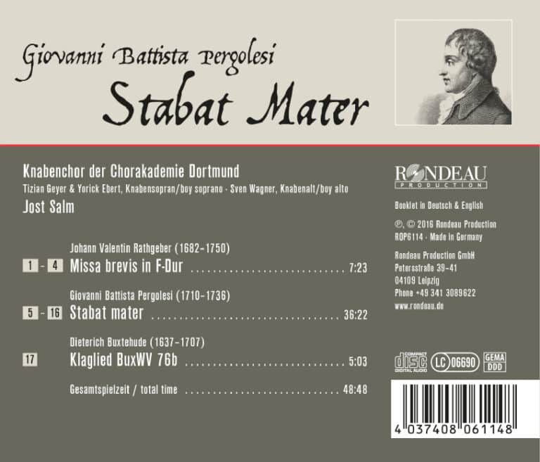 Durch seine hervorragenden Knabensolisten kommt der Knabenchor der Chorakademie Dortmund dem Klangideal der Kastraten der Barockzeit deutlich näher als es Sopranistinnen oder Countertenöre je könnten. Dank der kleinen Besetzung muten die Werke von Rathgeber, Pergolesi und Buxtehude dabei wunderbar leicht und unaufgeregt an. Als Leiter des Knabenchors der Chorakademie Dortmund legt Jost Salm besonderen Wert auf individuelle Stimmausbildung seiner Sänger. Nicht durch Gleichklang, sondern durch Summierung des Besonderen vermögen es Chor und Solisten, den verschiedenen Stilistiken unterschiedlicher Werke gerecht zu werden. Für die Aufnahme von Johann Valentin Rathgebers Missa brevis, Giovanni Battista Pergolesis Stabat Mater und Dietrich Buxtehudes Klaglied ist dem Chor dabei ein Meisterstück gelungen: Dem exzellenten Knabensopran tritt ein ebenso hervorragender Knabenalt zur Seite. Gemeinsam harmonieren sie als kongeniale Partner, ohne sich stimmlich zu sehr an einander anzugleichen. Dank der kleinen Besetzung haftet Rathgebers Missa brevis so eine wunderbare Leichtigkeit an, da die Knaben allein von der Orgel begleitet werden. Höhepunkt ist Pergolesis Stabat Mater, in dem der Chor einige Solopartien übernimmt, wodurch das Stück an Kraft und Ausdruck gewinnt.