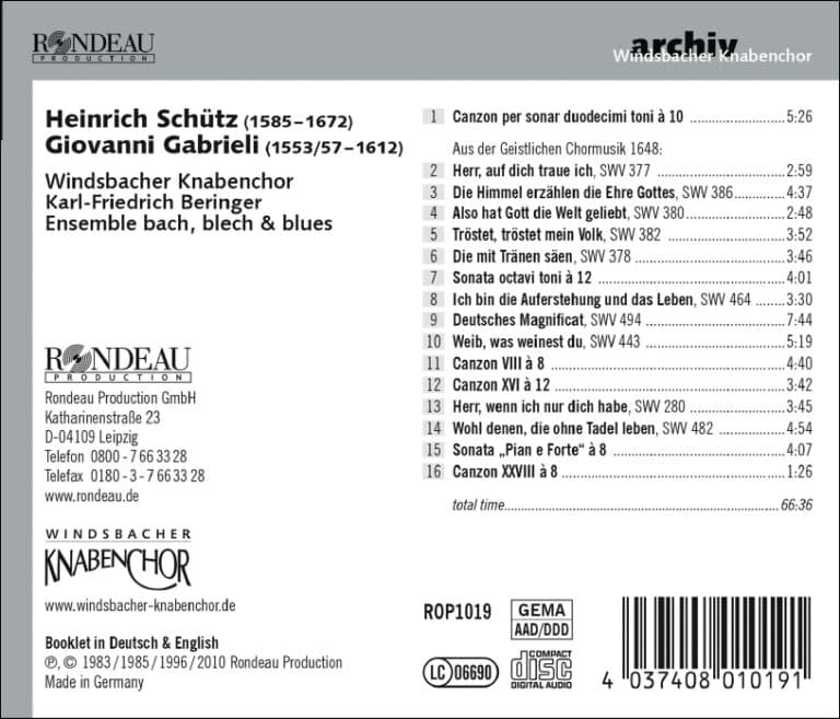 Venedig steht im Mittelpunkt dieser Einspielung. Erstmals musizieren das renommierte Blechbläserensemble bach, blech & blues und der Windsbacher Knabenchor gemeinsam auf einer CD. Festliche Bläsermusik von Giovanni Gabrieli umrahmt die von den Windsbachern gesungenen Motetten. Gabrieli wirkte als Komponist, Kapellmeister und Organist am Markusdom. Dort war der berühmte venezianische Meister mehrere Jahre Lehrer des jungen Heinrich Schütz. Mit Teilen der Geistlichen Chormusik 1648, der Musikalischen Exequien 1635 und dem bekannten Deutschen Magnificat 1671 interpretieren die Windsbacher Werke aus allen Schaffensperioden von Heinrich Schütz.