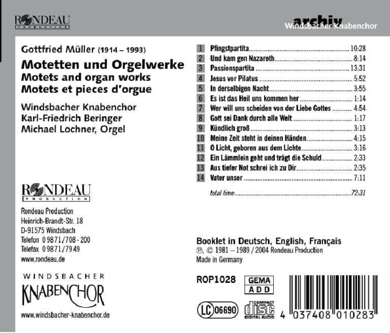 Gottfried Müller gehört zu den stärksten Begabungen, die mir in meinem Leben vorgekommen sind […] berufen, eine entscheidende Rolle in der Gestaltung der Musik der nächsten Jahre zu spielen“, attestierte der weltbekannte Dirigent Fritz Busch Anfang der 30er Jahre. 1914 in Dresden geboren, wurde der Komponist Gottfried Müller in der Nachkriegszeit Dozent für Musiktheorie am Meistersingerkonservatorium in Nürnberg. Dort verstarb er 1993. Mit dieser CD in der Serie Archiv Windsbacher Knabenchor würdigt Rondeau Production das vielbewegte Lebenswerk Müllers: Als Schüler des Komponisten geben Karl-Friedrich Beringer (Dirigent) und Michael Lochner (Orgel) dem Hörer Einblicke in das Verständnis der Musik Gottfried Müllers.