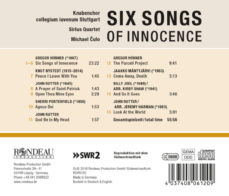 Rhythmisch mitreißend und musikalisch eindringlich formuliert erklingen die ’six Songs of Innocence“ für Knabenchor und Streichquartett von Gregor Hübner, Geiger des Sirius Quartet New York. Die Begeisterung der jungen Sänger des Knabenchores collegium iuvenum Stuttgart für diese Musik überträgt sich unmittelbar auf den Hörer. Für viele mag es schon ein Wunder sein, Jungs für klassische Musik begeistern zu können – von Chorgesang ganz zu schweigen. Die Knaben vom Collegium Iuvenum Stuttgart machen hier jedoch eine Ausnahme. Mehr noch: Sie sind auch offen für zeitgenössische Kompositionen – vor allem, wenn sie ihnen als Auftragswerk auf den Leib geschrieben wurden. Der aus Stuttgart stammende Geiger des Sirius Quartet, Gregor Hübner, hat zum 25. Jubiläum des Vokalensembles die ’six Songs of Innocence“ für Knabenchor und Streichquartett geschrieben – eine ungewöhnliche Kombination: Mitreißende, stark rhythmische Musik, mal jazzig, mal meditativ mit atemberaubenden Improvisationen der Streicher und anspruchsvollen Chorpassagen stellt dem Hörer Texte des englischen Dichters William Blake (1757-1827) vor. Der war Künstler, Dichter, Mystiker und Visionär – ein radikaler Denker, der seine Verse in einer Epoche des sozialen und politischen Wandels verfasste.