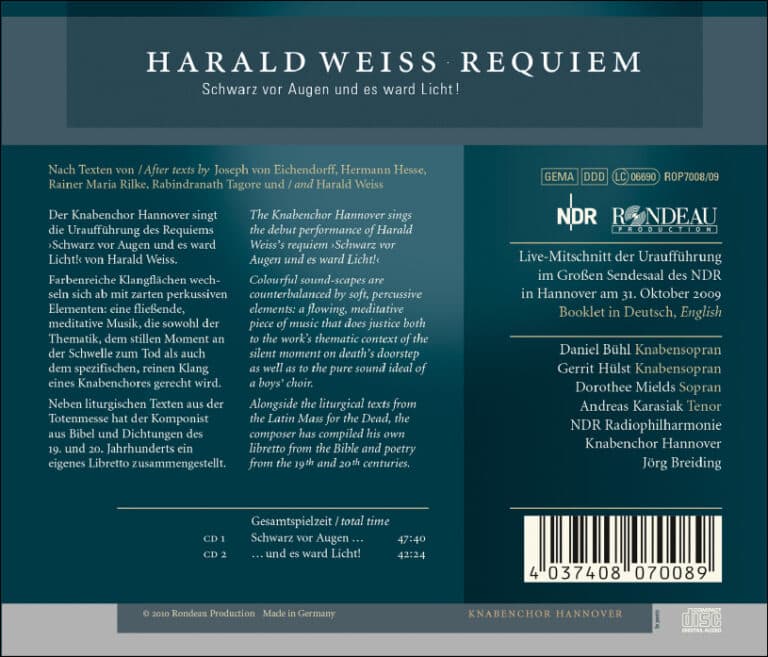 Der Knabenchor Hannover singt auf dieser CD die Uraufführung des Requiems Schwarz vor Augen und es ward Licht! von Harald Weiss. Mehr als ein Jahr haben die Knaben und Männer mit Chorleiter Jörg Breiding an diesem Stück gearbeitet, und nun verdichtet sich die Arbeit auf rund 90 Minuten. Die Kantorei St. Stephani und die Bremer Philharmonikern führten im Rahmen des Bremer Kirchentags 2009 bereits Teile aus dem Gesamtwerk auf. Der zeitgenössische Komponist Weiss hat dieses große Werk dem Knabenchor Hannover gewidmet, weil er sich dem Chor seit vielen Jahren verbunden fühlt. Aber in diesem speziellen Fall geht es ihm um die Wesenhaftigkeit von Knabenstimmen. In dem Requiem Schwarz vor Augen und es ward Licht! verändern sich die Töne kaum – und doch passiert in der Musik ganz viel. Klangschichten bauen sich auf, eine einzelne Knabenstimme singt die Worte: Lehre uns bedenken … aus dem 90. Psalm. Der Beginn des Requiems ist der Beginn einer Reise nach innen. „Ich möchte, dass sich der Klang im Innersten meiner Zuhörer einstellt“, so Weiss bei einem Gespräch über sein Requiem, wenige Tage vor der Uraufführung.