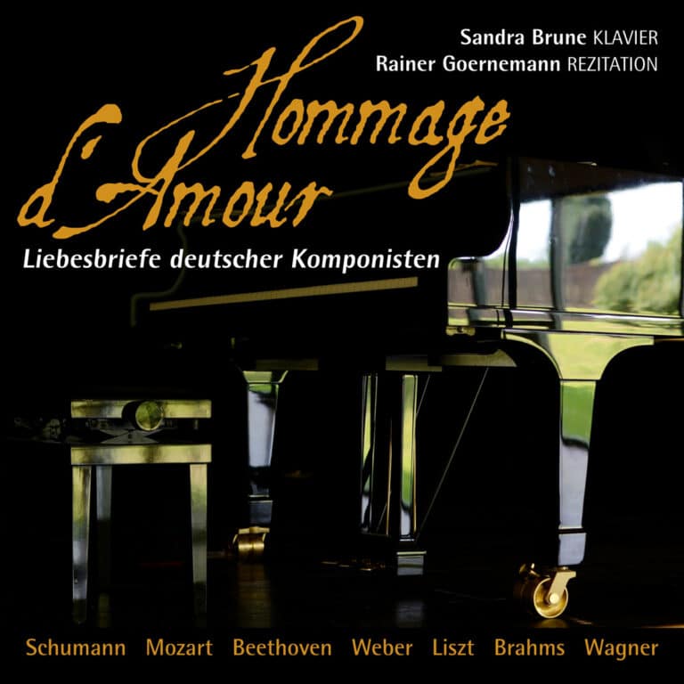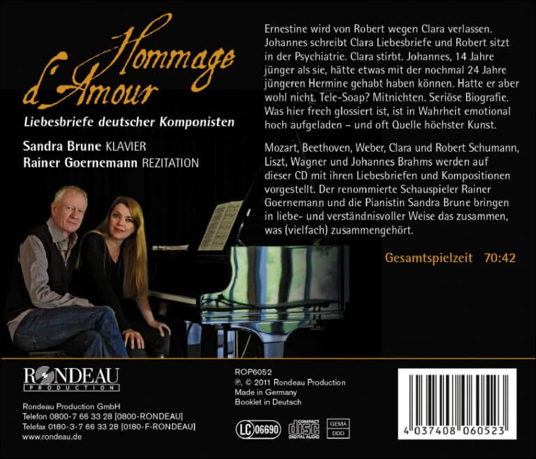 Ernestine wird von Robert wegen Clara verlassen. Johannes schreibt Clara Liebesbriefe und Robert sitzt in der Psychiatrie. Clara stirbt. Johannes, 14 Jahre jünger als sie, hätte etwas mit der nochmal 24 Jahre jüngeren Hermine gehabt haben können. Hatte er aber wohl nicht. Tele-Soap? Mitnichten. Seriöse Biografie. Was hier frech glossiert ist, ist in Wahrheit emotional hoch aufgeladen – und oft Quelle höchster Kunst. Mozart, Beethoven, Weber, Clara und Robert Schumann, Liszt, Wagner und Johannes Brahms werden auf dieser CD mit ihren Liebesbriefen und Kompositionen vorgestellt. Der renommierte Schauspieler Rainer Goernemann und die Pianistin Sandra Brune bringen in liebe- und verständnisvoller Weise das zusammen, was (vielfach) zusammengehört. Goernemann liest in deutscher Sprache aus den Briefen der berühmten Komponisten.