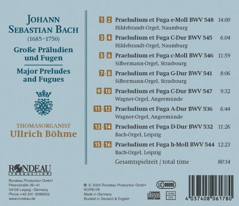 Dass Johann Sebastian Bach (1685–1750) als einer der bedeutendsten Orgelkomponisten aller Zeiten zählen darf, gilt bis heute als unbestritten. Als Pionier des Fugenstils entwickelte der in Eisenach geborene Komponist, der zeitlebens vor allem als Thomaskantor in Leipzig wirkte, eine neue kompositorische Dimension, die für Organisten aller Welt klanglich und musikalisch einen bis heute unabdingbaren neuen Kosmos offenlegen sollte. Die Vielseitigkeit der Orgelwerke Bachs, die nahezu alle barocktypischen und von ihm selbst konzipierten Form- und Satztypen beinhaltet, stellt nicht nur Musikwissenschaftler vor viele Fragen, sondern erweist sich auch für Organisten als musikalisch hochanspruchsvoller Komplex, den es interpretatorisch stets zu lösen gilt. Mit Bachs großen Präludien und Fugen erklingen auf der vorliegenden CD ausgewählte Orgelwerke des Komponisten, die innerhalb des vollkommenen Gesamtwerks besondere Stellungen einnehmen oder kompositorische Höhepunkte darstellen. Die Crème de la Crème eines ohnehin herausragenden Werkes, gespielt von Thomasorganist Ullrich Böhme. Auf Instrumenten, die mit dem Meister selbst in enger Verbindung stehen.