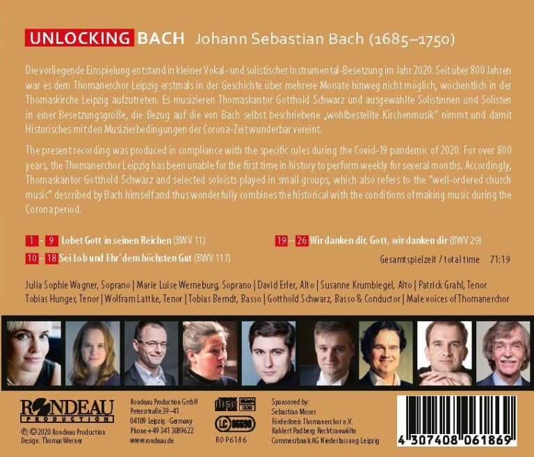 Unter der Leitung von Thomaskantor Gotthold Schwarz erklingen drei Kantaten von Johann Sebastian Bach in der Leipziger Thomaskirche. Die Aufnahme enstand Ende Mai 2020. Das Video wurde als Eröffnungskonzert beim Bach Marathon 2020 weltweit über die Kanäle des Leipziger Bachfestes gesendet. Es ersetzte damit das Eröffnungskonzert des Leipziger Bachfestes, das in diesem Jahr abgesagt wurde. Dort hätte der Thomanerchor eigentlich in gewohnt chorischer Besetzung die Kantate 29 zur Eröffnung aufgeführt. Nun erklang die Kantate im Videostream mit einem klein beziehungsweise solistisch besetzten Ensemble. Einige Männerstimmen des Thomanerchores und weitere Gäste bilden den Chor, der ganz nach dem Vorbild von Johann Sebastian Bach mit drei bis vier Sängern pro Stimme besetzt ist. Das Sächsische Barockorchester musiziert in solistischer Besetzung. Mit Kantate 11, dem Himmelfahrtsoratorium, und Kantate 117, Sei Lob und Ehr dem höchsten Gut, hat Thomaskantor Gotthold Schwarz zwei weitere klangvolle Kantaten gewählt. Die kleine Besetzung und die hervorragenden Solistinnen und Solisten glänzen mit einer enormen Musizierfreude, die die vorliegende Einspielung zu einem Höhepunkt der Bach-Interpretation machen.