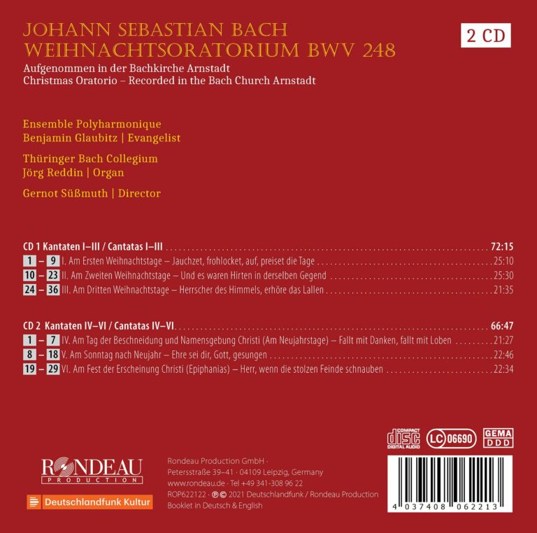 Deutschlandfunk Kultur und Rondeau Production präsentieren die neue Einspielung des bekannten Weihnachtsoratoriums von Johann Sebastian Bach: Klanglich hat die neue Doppel-CD tatsächlich etwas Besonderes zu bieten. Alle Vokalstimmen – sowohl die Chöre als auch die solistischen Partien – übernimmt das Ensemble Polyharmonique. In der Fachwelt sind die acht Sängerinnen und Sänger hoch gelobt für ihre beeindruckenden und stilgerechten Interpretationen Alter Musik. Das Thüringer Bach Collegium spielt in solistischer Besetzung unter der Leitung seines Konzertmeisters Gernot Süßmuth. Herausragend unter den historischen Instrumenten dieser Neueinspielung ist die Wender-Orgel der Bachkirche Arnstadt, auf der Johann Sebastian Bach einst selbst gespielt hatte. Der Arnstädter Kirchenmusiker Jörg Reddin bereichert in den Chören die Continuogruppe mit dem festlichen Klang der großen Kirchenorgel und verleiht der Musik eine brillante Klangfarbe, wie sie die kleinen heute üblichen Truhenorgeln nicht bieten können.