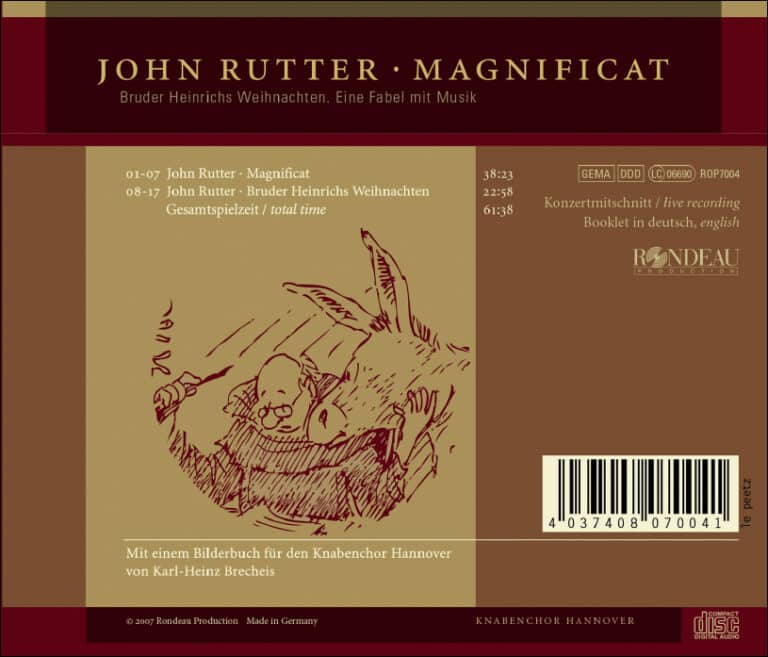 Erst seit wenigen Jahren ist man in Deutschland auf den englischen Komponisten John Rutter aufmerksam geworden. In seiner Heimat gehört er dagegen zu den meistaufgeführten Tonkünstlern. Auf dieser CD des Knabenchores Hannover sind zwei Werke Rutters zu hören, an der auch viele Kinder ihren Spaß haben werden. Rutter verbindet in seiner Magnificat-Vertonung lateinamerikanische Rhythmen, Anklänge an Filmmusik, sowie englische Weihnachtslieder und gregorianische Hymnen zu einem eindrucksvollen Werk für Solosopran, Chor und Orchester. Nicht nur die Kombination aus lateinischem und englischem Text zeigt, dass Rutters Magnificat ein in jeder Hinsicht außergewöhnliches Werk ist. Das 1990 in der Carnegie Hall unter dem Komponisten selbst uraufgeführte Werk ist eine beeindruckende, vollkommen neuartige Interpretation des Lobgesangs der Maria. Das zweite Werk der CD „Bruder Heinrichs Weihnachten“ erscheint als Ersteinspielung in deutscher Sprache. Eingebettet in sanfte Klänge liest Arndt Schmöle die weihnachtliche Geschichte in Begleitung des Knabenchores Hannover und der Nürnberger Symphoniker. Das Besondere an der CD: Liebevoll gestaltete Zeichnungen von Karl-Heinz Brecheis illustrieren die Geschichte von Bruder Heinrich und seinem Esel Sigismund.