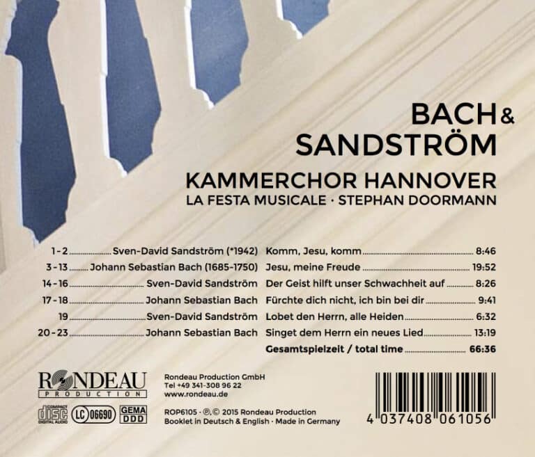 Das Werk Johann Sebastian Bachs hat den schwedischen Komponisten Sven-David Sandström (*1942) schon immer fasziniert und animierte ihn zu eigenen Werken. Neben einer Matthäus-Passion auf den Text Picanders nahm sich der Skandinavier auch der Motettentexte des Thomaskantors an. Hierbei entstanden faszinierende Werke, die ihre Schönheit vor allem in der kunstvollen Gegenüberstellung, wie sie diese CD präsentiert, entfalten: „Jesu, meine Freude“, ’singet dem Herrn ein neues Lied“ und „Fürchte Dich nicht, ich bin bei dir“ von Bach, von Sandström „Der Geist hilft unsrer Schwachheit auf“, „Komm, Jesu, komm“ und „Lobet den Herrn alle Heiden“. Der Kammerchor Hannover taucht unter der Leitung seines Dirigenten Stephan Doormann tief in die genial konstruierten Werke ein: Barocke Eleganz und Tonkunst bei Bach, berauschende Cluster und komplexe Rhythmen bei Sandström, die von den Stimmen höchstes Einfühlungsvermögen fordern. Spannend ist hier die an vielen Stellen fast schon plastisch auskomponierte Art und Weise, wie die bekannten Texte in neue Klänge gefasst wurden. Immerhin war auch Bach zu Lebzeiten ebenfalls Komponist zeitgenössischer Musik – und Visionär, der weit über das, was seinerzeit en vogue war, hinausging.