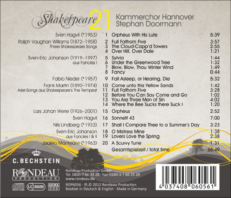 Die rund 400 Jahre alten Texte von William Shakespeare haben bis heute nichts von ihrer Anziehungskraft und Wirkung verloren. Immer wieder inspirieren sie verschiedenste Künstler zu neuen Schöpfungen. Der Kammerchor Hannover unter der Leitung von Stephan Doormann lädt mit dieser CD zu einer Zeitreise ein: 400 Jahre alte Texte erklingen in Vertonungen des 20. und 21. Jahrhunderts von Ralph Vaughan Williams, Sven-Eric Johanson, Lars Johan Werle, Nils Lindberg und Jaakko Mäntyjärvi. Außerdem erteilte der Kammerchor Hannover den Komponisten Sven Hagvil (Schweden) und Fabio Nieder (Deutschland) Kompositionsaufträge. Die erstmals auf CD eingespielten Werke zeigen eindringlich die Zeitlosigkeit und ungebrochene Faszination, die Shakespeares Texten inne wohnen.