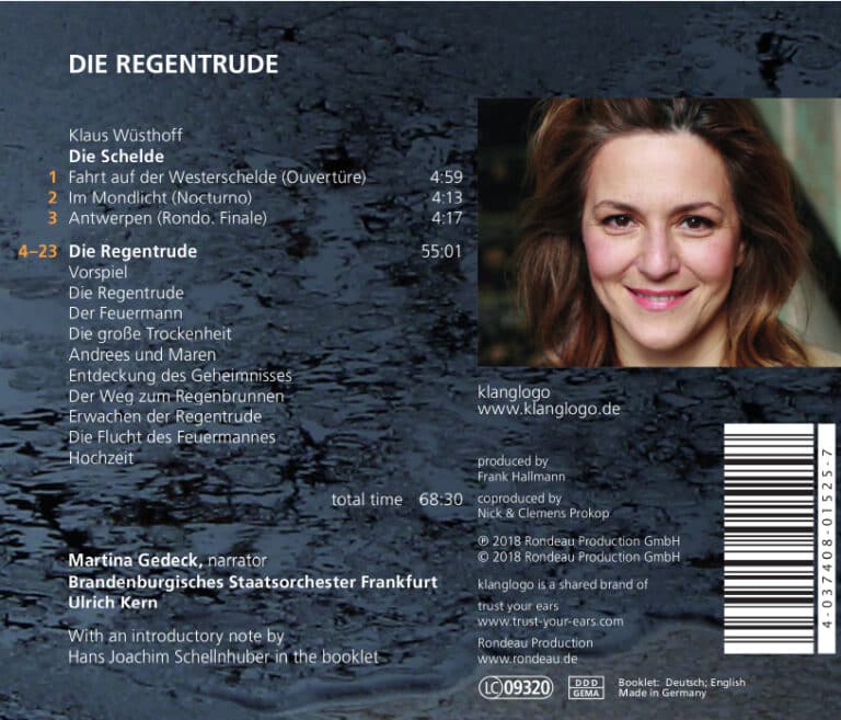 Die literarische Vorlage für die Orchesterkomposition Die Regentrude von Klaus Wüsthoff ist das gleichnamige Klima-Märchen von Theodor Storm. Übertragen auf die heutige Zeit geht es darin um die Zerstörung der Umwelt, den Klimawandel durch den Menschen und die Bedeutung eines ausgeglichenen Klimas. Die Musik bewegt sich zwischen Tradition und Moderne, in einer Vielfalt von Klangfarben, Rhythmen, heiter-skurrilen und spannend-dramatischen Momenten. Mit einer am Schluss überwältigenden spätromantischen Opulenz kommt die Haltung des 95 jährigen Komponisten zu einem der drängendsten Themen der Menschheit zum Ausdruck. Die auf dieser CD festgehaltene Uraufführung der Regentrude vom 27. Januar 2018 steht im Zusammenhang mit dem Projekt „Klimaglocken“. Dabei erklingt das Leitmotiv aus Wüsthoffs Komposition auf Turmglockenspielen, um so die Menschen an die Verantwortung für Umwelt und Klima zu erinnern und das „Zwei-Grad-Ziel“ nicht aus den Augen zu verlieren. Mit der bekannten Schauspielerin Martina Gedeck als versierter Erzählerin und Ulrich Kern am Dirigentenpult des Brandenburgischen Staatsorchesters Frankfurt ist eine fesselnde und zugleich denkwürdige Interpretation geglückt.