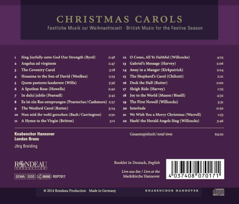 Wie kein anderes Fest im Kirchenjahr hat die Geburt Jesu Komponisten weltweit zu wunderbarer Musik inspiriert. So nimmt England mit seinen Liedern einen wichtigen Platz im Repertoire auch vieler deutscher Chöre ein: The Coventry Carol, Joy to the World oder Away in a Manger sind heute ebensolche englischsprachigen Klassiker wie Hark! the Herald Angels Sing, The First Nowell und We Wish You a Merry Christmas. Gemeinsam mit London Brass aus Großbritannien hat der Knabenchor Hannover unter der Leitung von Jörg Breiding zahlreiche dieser Chrismas Carols aufgenommen. Mal rein vokal, mal instrumental, vor allem aber gemeinsam musizieren sie bekannte Melodien der englischen Weihnachtsmusik in attraktiven Arrangements und Kompositionen britischer Künstler wie David Willcocks und John Rutter sowie den ehemaligen King’s Singers Bob Chilcott und Simon Carrington. Der Schlusschoral von Bachs Weihnachtsoratorium im majestätischen Blechbläser-Klang ist dabei ebenso präsent wie Michael Praetorius“ Es ist ein Ros entsprungen in der anrührenden zeitgenössischen Fassung von Donald Cashmore oder der musikalischen übersetzung eines Herbert Howells.
