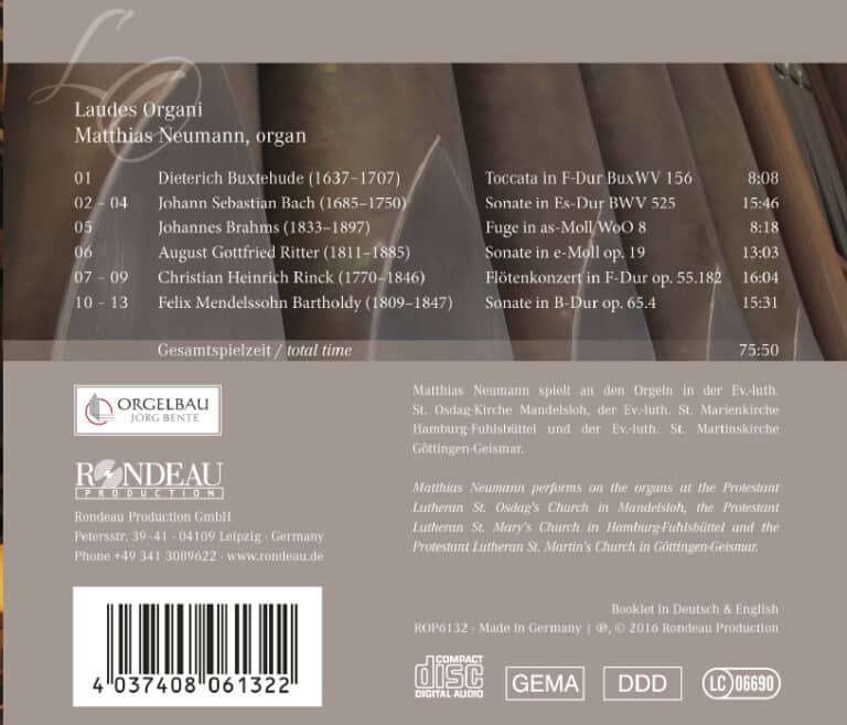 Philipp Furtwängler (1800-1867) und Alfred Führer (1905-1974) haben mehr als 80 Orgeln in Norddeutschland gebaut, von denen Bente Orgelbau in den letzten Jahren einige aufwendig restaurierte. Um den Facettenreichtum und die Klangfarbe dieser neu instand gesetzten Orgeln zu demonstrieren, hat der Hamburger Organist Matthias Neumann drei der spannendsten Instrumente besucht und an ihnen Werke der großen deutschen Meister vom Barock zur Romantik gespielt: Die Kompositionen von Johann Sebastian Bach, Felix Mendelssohn Bartholdy, Johannes Brahms , Christian Heinrich Rinck, August Gottfried Ritter und Dieterich Buxtehude geben Zeugnis darüber ab, wie sich der Klang der Orgeln, und damit auch die unterschiedlichen Kompositionsweisen, im Laufe der Zeit gewandelt haben.