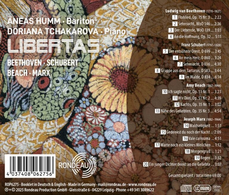 Wie kann man zu innerer Freiheit gelangen? Dieser Frage gehen auf musikalischem Wege der gefeierte und preisgekrönte Bariton Äneas Humm und die Pianistin Doriana Tchakarova auf ihrem neuen Album „Libertas“ nach. Sie erkunden hierfür selten zu hörendes Liedrepertoire der Romantik und des 20. Jahrhunderts von Ludwig van Beethoven, Franz Schubert, Amy Beach und Joseph Marx.
