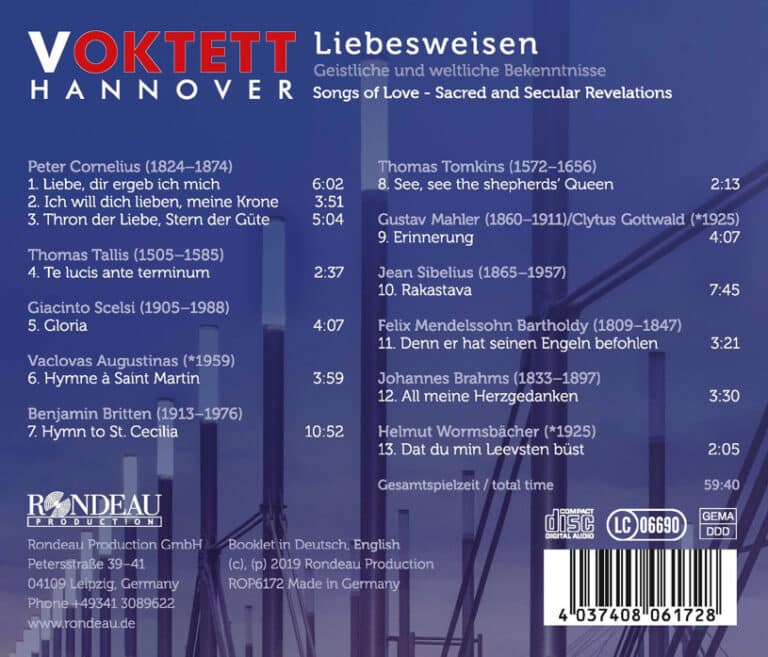 Das achtköpfige Ensemble Voktett Hannover, Erster Preisträger des Deutschen Chorwettbewerbs 2018, begeistert auf dieser Einspielung durch sein breites Repertoire: Neben romantischen Klassikern wie der Motette „Denn er hat seinen Engeln befohlen“ von Felix Mendelssohn Bartholdy finden sich hier sowohl deutlich ältere als auch zeitgenössische Werke. So erklingt unter anderem der Hymnus „Te lucis ante terminum“ in der Vertonung von Thomas Tallis. Aber auch Kompositionen des 20. und 21. Jahrhunderts kommen nicht zu kurz: Von Benjamin Brittens „Hymn to St. Cecilia“ über Giacinto Scelsis „Gloria“ bis hin zu Helmut Wormsbächers Arrangement des plattdeutschen Klassikers „Dat du min Leevsten büst“. Gemeinsam ist allen Stücken der Aufnahme die Liebe. Einerseits die Liebe zu anderen Menschen, andererseits die geistliche Liebe zu Gott. Aus allen Winkeln werden die vielseitigen Formen der Liebe und die Sichtweisen der Komponisten darauf beleuchtet. Die Konfrontation von Moderne mit der Polyphonie der Renaissance ergibt ein beeindruckendes und mitreißendes Gemisch Musikgeschichte, verpackt in einen vollstimmigen und perfekten Wohlklang.