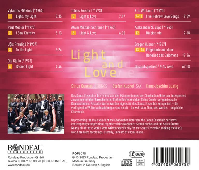 Crossover-Projekte sind das Markenzeichen des Sonux Ensembles. Der junge Männerchor interpretiert zusammen mit dem Jazz-Saxophonisten Stefan Kuchel und dem Sirius Quartet zeitgenössische Kompositionen. Die Musiker des Quartetts beschreiben sich selbst als Improvisationskünstler, die das konventionelle Klangvokabular eines Streichquartetts durchbrechen. Die meisten Stücke auf dieser CD wurden eigens für das Sonux Ensemble komponiert und dem Ensemble damit auf den Leib geschrieben. „Light and Love“, das titelgebende Gedicht von Charles Anthony Silvestri schafft eine Klammer und Verbindung zwischen beiden Themenkomplexen. Silvestri schrieb es 2012 exklusiv für diese Einspielung. Hans-Joachim Lustig lernte den amerikanischen Poeten über Eric Whitacre kennen, dessen Five Hebrew Love Songs auf dieser CD in einer bisher einmaligen Version für Männerstimmen eingespielt sind. Glück hatte der Chorleiter auch mit der Zusammenarbeit Paul Mealors: Der walisische Komponist wurde weltweit bekannt durch seine Motette Ubi caritas et amor, die für die Trauzeremonie von Prinz William und Kate Middleton in Westminster Abbey am 29. April 2011 entstanden ist und von dem das Wiegenlied für den neugeborenen Prinz George stammt.