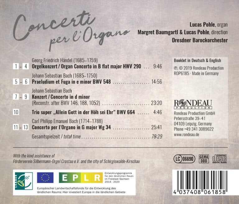 Nicht zuletzt deshalb, weil in Weltersteinspielung die Rekonstruktion eines Orgelkonzerts gewürdigt wird, das Johann Sebastian Bach vermutlich 1725 in Dresden uraufführte und heute leider als verschollen gelten muss. Ende der 1720er Jahre entstanden schließlich zwei Kantaten, in denen diese mögliche Dresdner Orgelkonzertfassung weitgehend erhalten sein dürfte: BWV 146 mit den ersten beiden Konzertsätzen sowie BWV 188 mit dem dritten Satz.