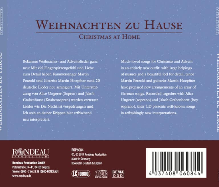 Das Schöne an Weihnachtsliedern ist, dass sie auch ganz leise, still und persönlich ihre phänomenale Kraft entwickeln können. Dass sie ohne großen Orchesterapparat in der Lage sind, den Zuhörer zu berühren, mitzunehmen und ganz individuell jeden an den Ort bringen, der für ihn Weihnachten bedeutet. Kammersänger Martin Petzold und Gitarrist Martin Hoepfner haben aus der Vielzahl deutschsprachiger Weihnachts- und Adventslieder ihre Favoriten ausgewählt, und ihren Ansprüchen und Vorstellungen gemäß arrangiert. Unterstützt von Alice Ungerer (Sopran) und Jakob Grabenhorst (Knabensopran) singen und spielen sie alte Weisen wie „Es kommt ein Schiff geladen“, „Ich steh an deiner Krippen hier“ und „Wie soll ich dich empfangen“, aber auch neue Lieder wie das von Thomaskantor Georg Christoph Biller komponierte ’simeon“. Mit viel Fingerspitzengefühl und wunderbarem Sinn für Details ist es mit dieser CD gelungen, selbst die berühmtesten Weihnachts- und Adventslieder so frisch und unverbraucht klingen zu lassen, dass jeder in ihnen gleichermaßen Vertrautes wie Neues entdecken kann – ganz davon abhängig, was Weihnachten für ihn bedeutet. …und damit dem Zuhörer auch richtig warm ums Herz wird, befindet sich in jeder CD-Hülle eine kleine Weihnachtskerze!