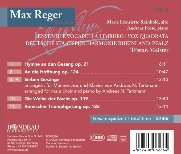 Paul Hindemith nannte ihn den „letzten Riesen in der Musik“ und bezog sich damit nicht nur auf Max Regers umfangreiches Œuvre, sondern auch auf dessen Bedeutung für die Musikgeschichte. Neben zahlreichen Werken für Orgel, Klavier und Orchester schrieb Reger eine Vielzahl an Werken für Männerchor. Um diese so leicht und anmutig klingen zu lassen, wie es sich Reger gewünscht hat, bedarf es eines exzellenten Chores: Die Ensembles Vocapella Limburg und Vox Quadrata unter Leitung von Tristan Meister, begleitet von der Deutschen Staatsphilharmonie Rheinland-Pfalz, verstehen sich bestens darauf, den Geist dieser Werke perfekt wiederzugeben. Diese Einspielung ergänzt die Gesamtschau über Regers Werke für Männerchor um Werke mit Orchesterbegleitung, darunter vor allem eine Sammlung von „Sieben Gesängen für Männerchor und Klavier“, zusammengestellt aus Regers frühem Schaffen – eine Folge von eher kürzeren, schlank gehaltenen Liedern in einem zyklischen Bogen zwischen Frühling, Liebe, Vergangenheit bis zu Winterahnung und Tod. Darüber hinaus erklingen die „Hymne an den Gesang“ op. 21, „Die Weihe der Nacht“ op. 119, der Orchestergesang „An die Hoffnung“ op. 124 nach einem Text von Friedrich Hölderlin und Regers klangkolossalen Römischer Triumphgesang op. 126.