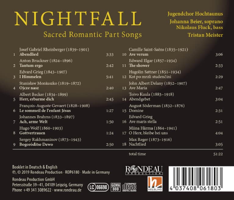 Unter Romantik versteht jeder etwas anderes und auch die Komponisten jener Epoche gingen verschiedene Wege, um ein bestimmtes Sujet zu vertonen. In der geistlichen Musik fallen einem natürlich sofort bestimmte Namen und Stücke ein: Felix Mendelssohn Bartholdy, Anton Bruckner, Josef Gabriel Rheinberger, Max Reger und andere. Doch die Zeit zwischen 1789 und 1914 hat eine Vielzahl von Komponisten hervorgebracht, die dieser Epoche ihr Gesicht gaben – und das nicht nur in Deutschland. Mit der CD „Nightfall – Sacred Romantic Parts Songs“ stellt der Jugendchor Hochtaunus unter der Leitung seines Künstlerischen Leiters Tristan Meister 18 Werke europäischer Komponisten der Romantik vor. Man hört Bekanntes wie Regers „Nachtlied“, Rheinbergers „Abendlied“ und Brahms‘ „Ach, arme Welt“, aber eben auch spannende Neuentdeckungen wie eine „Vater unser“-Vertonung des Polen Stanislaw Moniuszko oder das „Herr bleibe bei uns“ von Miina Härma aus Estland. Der ausgewogene und zugleich jugendlich-frische Klang des hervorragend abgestimmten Ensembles verleiht jedem Lied einen besonderen Reiz und sorgt bei den bereits oft gehörten und vielfach eingespielten „Evergreens“ des romantischen Chorrepertoires beglückende Momente voller neuer Aspekte. Zu hören sind Psalm-Vertonungen, Abendgesänge und Wiegenlieder, Gebete und andere geistliche Betrachtungen.
