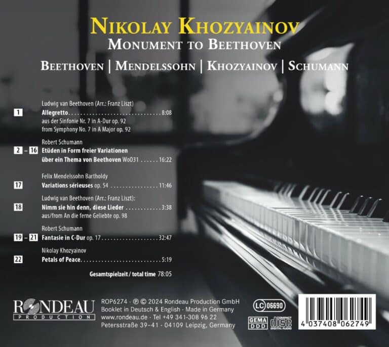 Der junge Ausnahmepianist Nikolay Khozyainov interpretiert auf diesem Album eine hochkarätige Auswahl jener Werke, die das Beethoven-Denkmal mitfinanziert haben. Die Werke haben dabei jeweils ihren ganz eigenen, mal eindeutigen, mal eher verdeckten Bezug zum Komponisten Beethoven. Darunter Liszts Klavier-Bearbeitung des düster-bewegten Allegrettos aus Beethovens 7. Sinfonie, Schumanns vielschichtige Etüden über ein Thema von Beethoven, Mendelssohns „Variations sérieuses“ und Schumanns Klavierfantasie in C-Dur. In bester Pianisten-Tradition fügt Nikolay Khozyainov dem Album noch eine eigene Komposition hinzu: die klangmalerisch zarten “Petals of Piece”, ein Auftragswerk für die United Nations Organisation und ganz im Zeichen des Friedens.