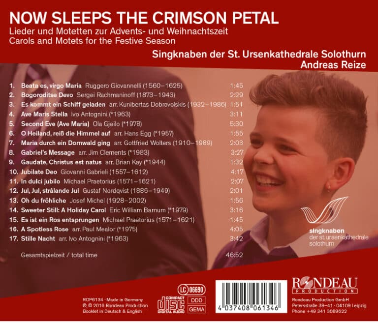 Die Singknaben der St. Ursenkathedrale Solothurn sind der älteste Knabenchor der Schweiz. Mit „Now Sleeps the Crimson Petal“ schlagen sie eine Brücke vom Mittelalter in die Moderne, indem sie Weihnachtslieder und -motetten der Alten Meister und zeitgenössischer Komponisten kunstvoll verbinden. So wird beim Lied „Es ist ein Ros entsprungen“ der wunderschöne Satz von Michael Praetorius (1571-1621) einer neuen Bearbeitung von Paul Mealor (*1975) gegenübergestellt. Alte Musik im neuen Gewand gibt es ebenso bei „Gaudate, Christus est natus“ und „O Heiland, reiß die Himmel auf“, aber auch beim mittelalterlichen Hymnus „Ave Maris Stella“, der von Ivo Antognini (*1963) eigens für den Chor neu in Musik gesetzt wurde. Mit „Now Sleeps the Crimson Petal“ reihen die Singknaben unter der Leitung von Andreas Reize musikalische Perlen aus verschiedenen Jahrhunderten aneinander, die alle einen Bezug zueinander haben und gemeinsam ein umfassendes Bild weihnachtlicher Traditionen im Laufe der Zeit vermitteln.